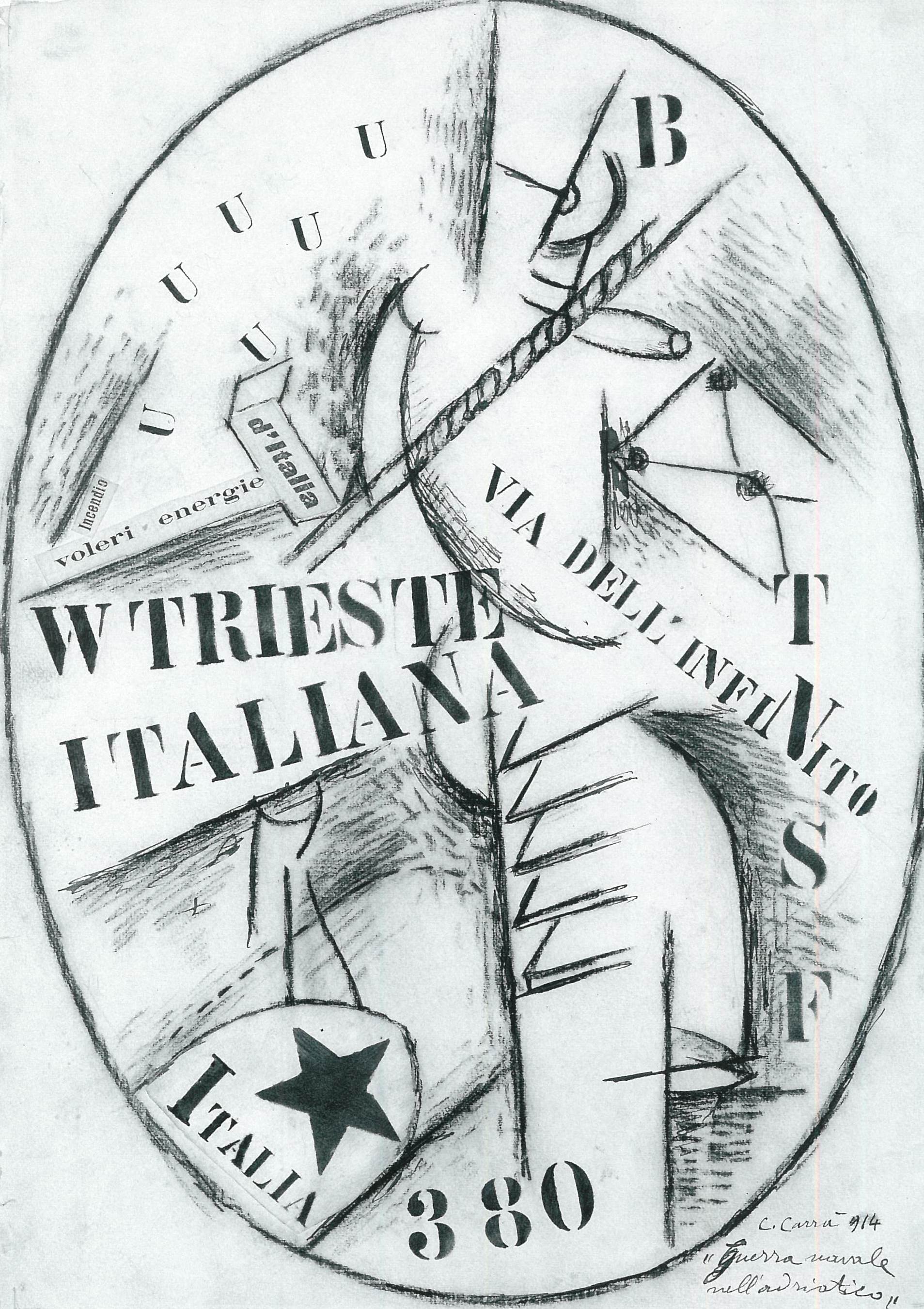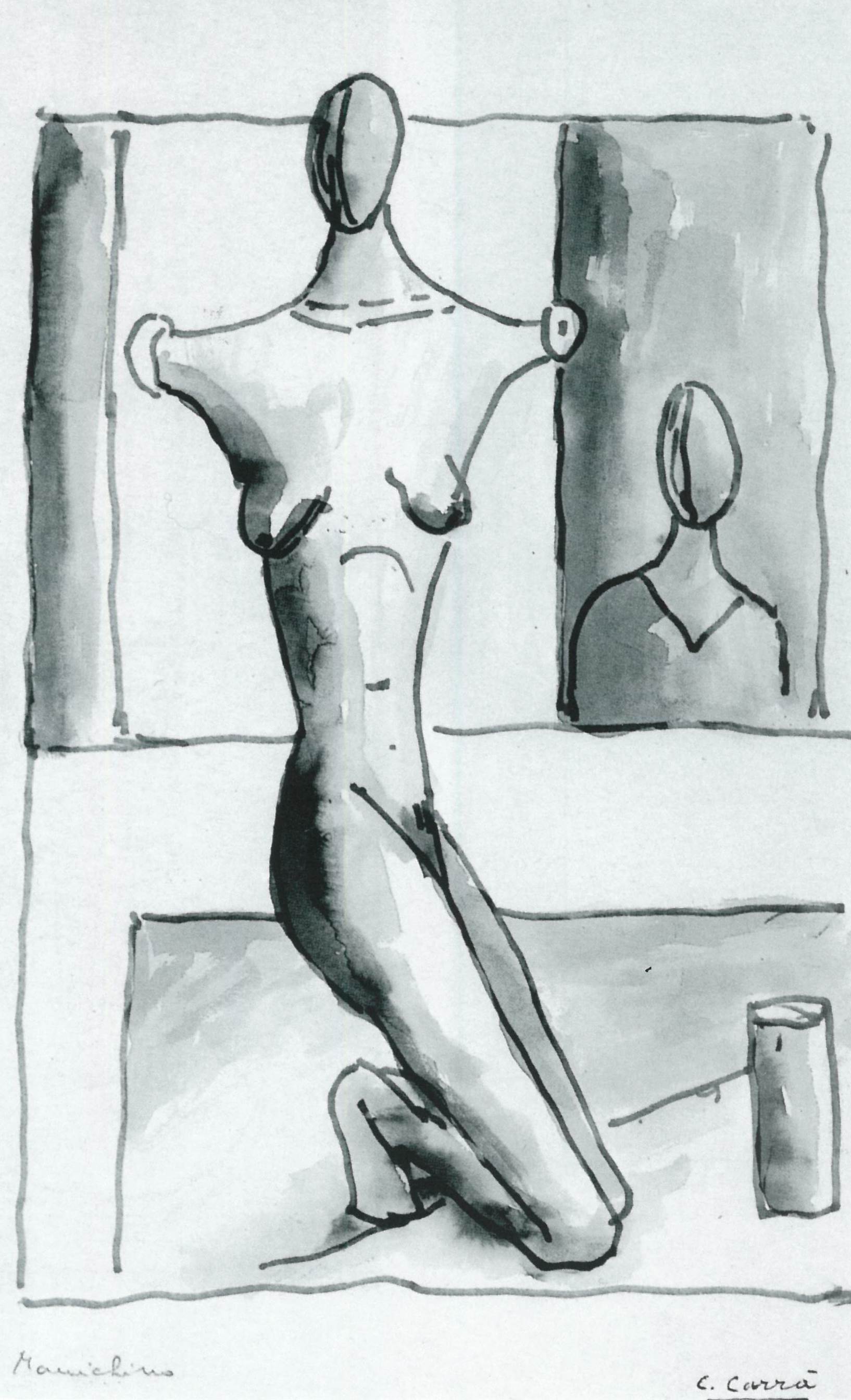 Drawing for Carrà was immediate and spontaneous, allowing him to quickly capture an emerging idea. He used it to explore and develop different aesthetic vocabularies, such as the Futurist preoccupation with speed and universal dynamism and the surreal juxtaposition of objects and mannequins characteristic of the Metaphysical school.