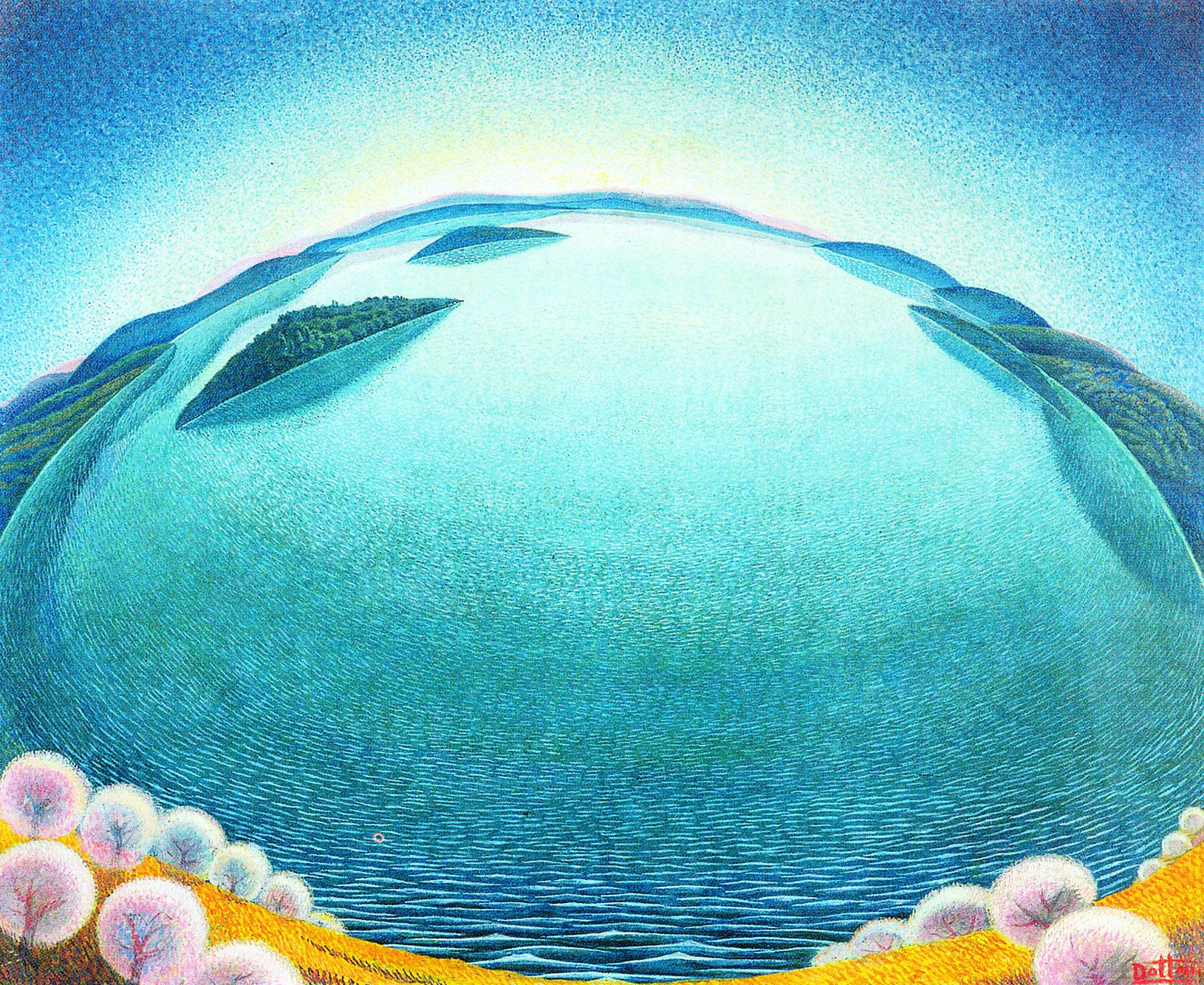 Dottori’s greatest contribution to Futurist aesthetics was his distinctive interpretation of aeropainting. In fact, a number of his works of the 1920s can be said to have anticipated the genre’s concerns, encapsulated in the belief that ‘the changing perspectives of flight constitute an absolutely new reality, one that has nothing in common with the reality traditionally constituted by earthbound perspectives’. With their sweeping panoramas and distorted horizons, suggesting the curvature of the earth, Dottori’s aeropaintings are infused with an atmosphere of serenity and lyricism that is unique in Futurist art.
