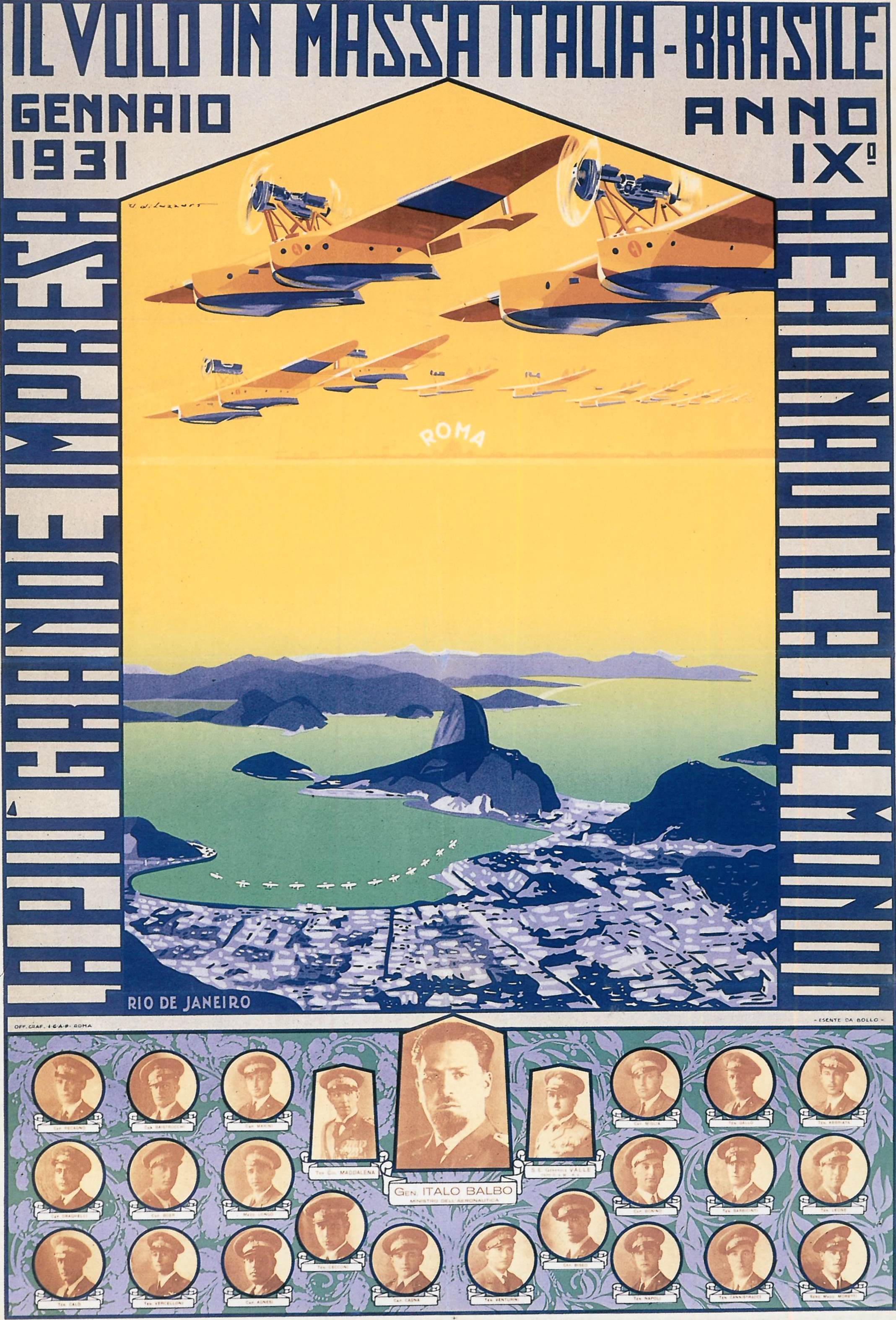 Aviation began to develop in Italy around 1910, and during the First World War the daring exploits of pilots such as Francesco Baracca and the poet Gabriele D’Annunzio were to capture the popular imagination. Following Mussolini’s rise to power in 1922, the inter-war years witnessed a tremendous expansion of both military and civil aviation, as well as a number of spectacular aeronautical feats. These included Italo Balbo’s legendary transatlantic flights of the 1930s, when he led squadrons of seaplanes flying in formation to Brazil and the United States. However, the events of World War II shattered the dream of Italian aeroplanes dominating the skies, decimating the aeronautics industry and leading to the deaths of many of the great figures of Italian aviation.
