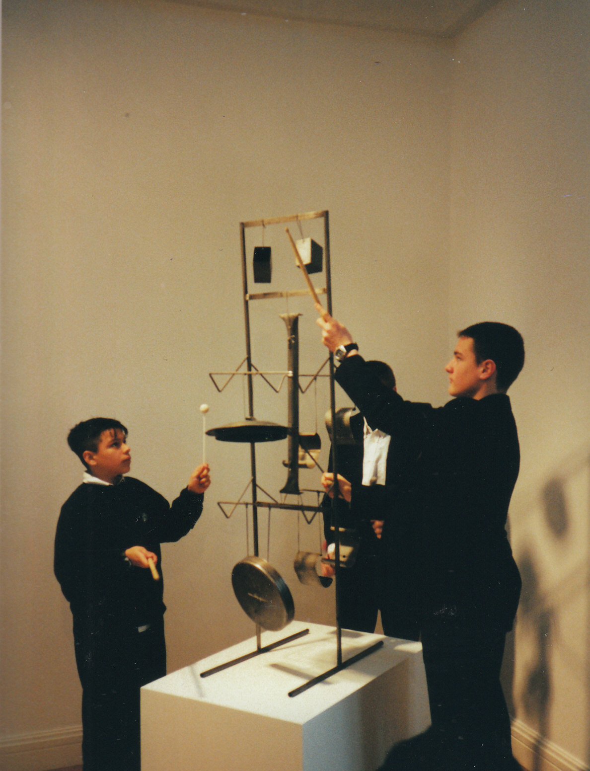 The early prototypes for Shiel’s sculptures came into being in the mid-1980s after he found and recycled scrap metal from his family’s electrical distribution business in Dublin. Brackets, hinges, flatirons, cogwheels and central heating pipes were beaten, scraped and silvered to bring out their visual and percussive possibilities and to create ‘families of sound’. Sampled and played by a variety of contemporary composers, Shiel’s sculptures extend our knowledge of the sound world, as much as Russolo’s experiments did eighty years ago.