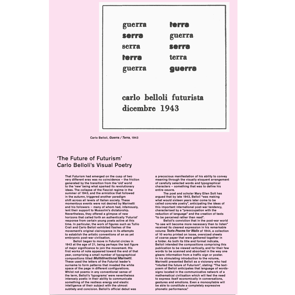 Although perhaps better known today for its contribution to the visual arts, Italian Futurism was in fact founded and led by a poet – Filippo Tommaso Marinetti – and the many writers who gravitated toward the movement would go on to produce a body of work that was as vast and as groundbreaking as that of its painters. The first part of this display charts the distinct phases through which Futurist poetry passed, with a particular focus on those forms of experimentation that reflected the movement’s desire to “redouble the expressive force of words” by emphasising and exploiting the visual and/or sonic dimensions of language.