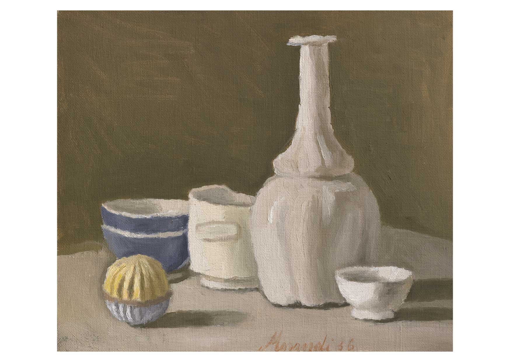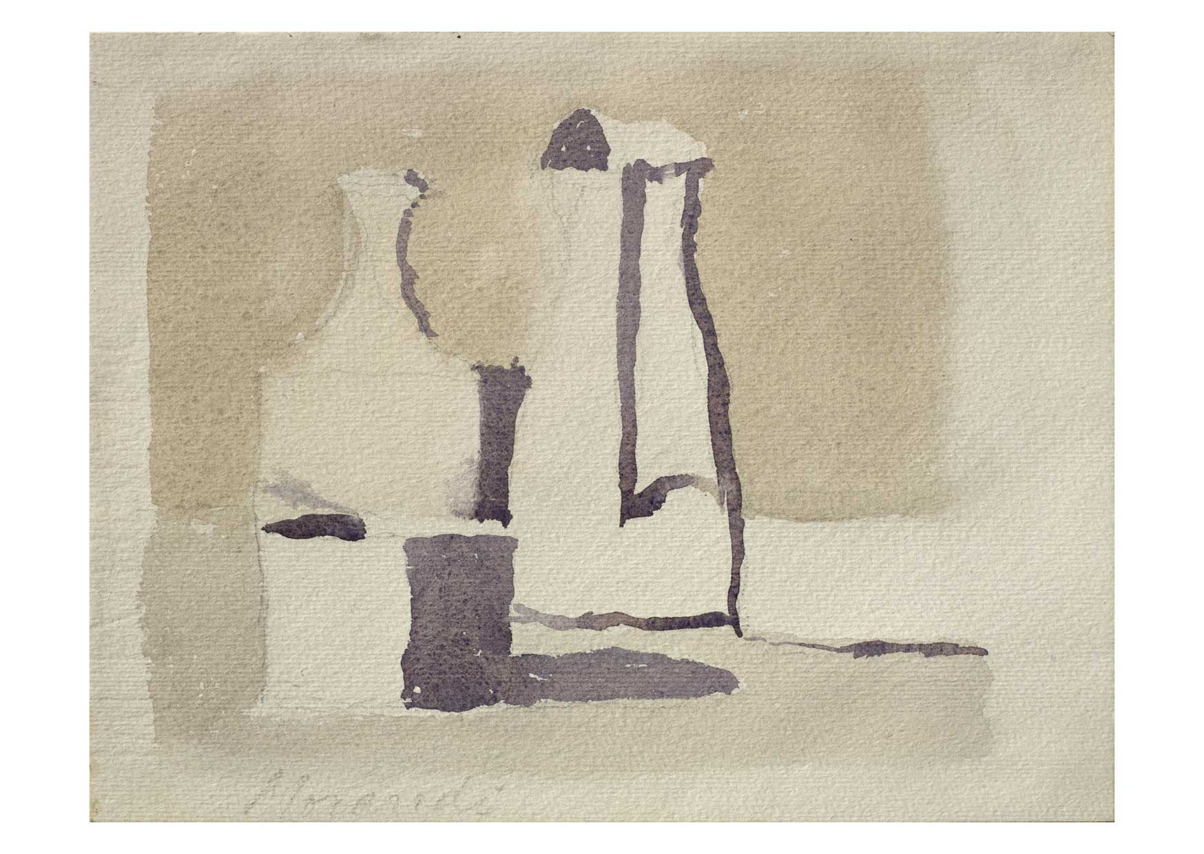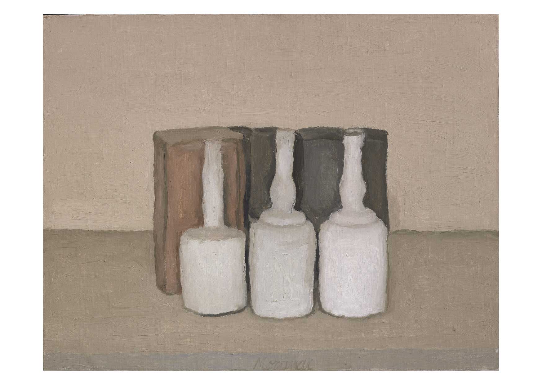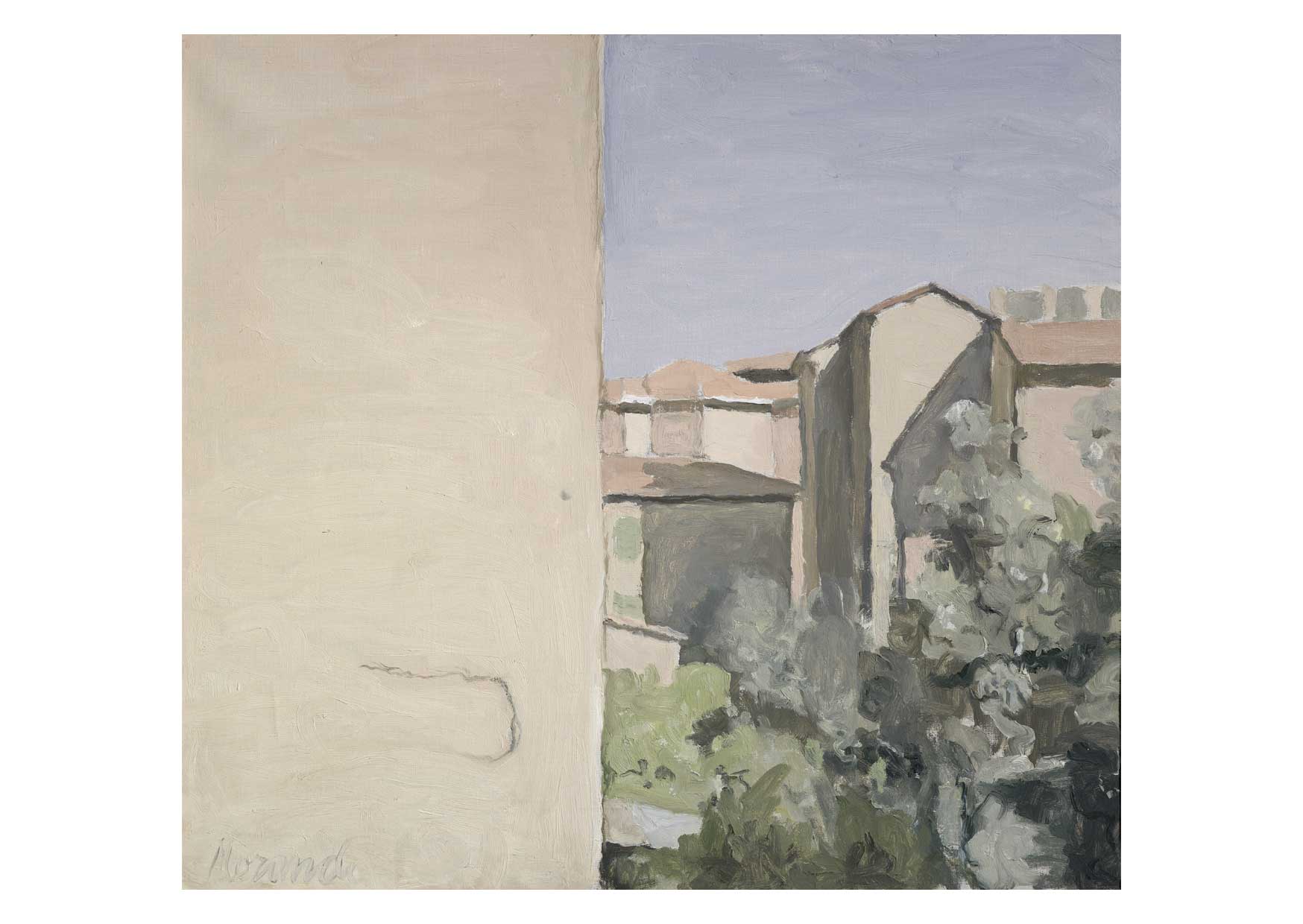 Giorgio Morandi, Still Life, Natura Morta, 1936, oil on canvas, 32 x 37 cm; Metaphysical Still Life, Natura morta metafisica, 1918, oil on canvas, 54 x 38 cm; Still Life, Natura Morta, 1960, watercolour on paper, 16 x 20.5 cm; Still Life, Natura Morta, 1953, oil on canvas, 35.5 x 45.5 cm; The Courtyard on Via Fondazza, Cortile di via Fondazza, 1954, oil on canvas, 48 x 53 cm. Fondazione Magnani-Rocca © DACS 2023