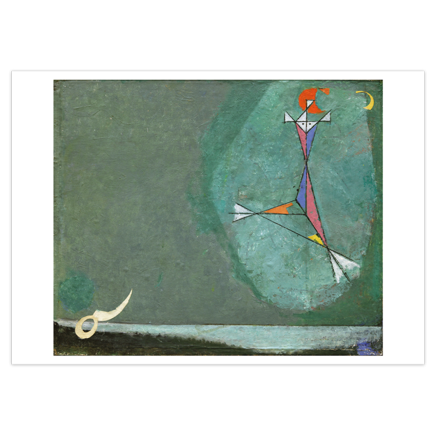 Rebellious Angel with Red Heart, Angelo ribelle con cuore rosso, 1953, Oil on canvas, 88 x 116 cm, private collection; Angel of Santa Rosa, Angelo di Santa Rosa, 1957, Oil and paper on canvas, 56 x 68 cm, Lorenzelli Arte, Milan; Homage to Cavalcanti, Omaggio a Cavalcanti, 1954, Oil on board, 28.5 x 37 cm, private collection; Rhythm: Abstract Designs on White Background, Ritmo. Schemi astratti su fondo bianco, 1931–32, Oil on canvas, 27 x 20 cm, Lorenzelli Arte, Milan. All works by Osvaldo Licini © DACS 2023