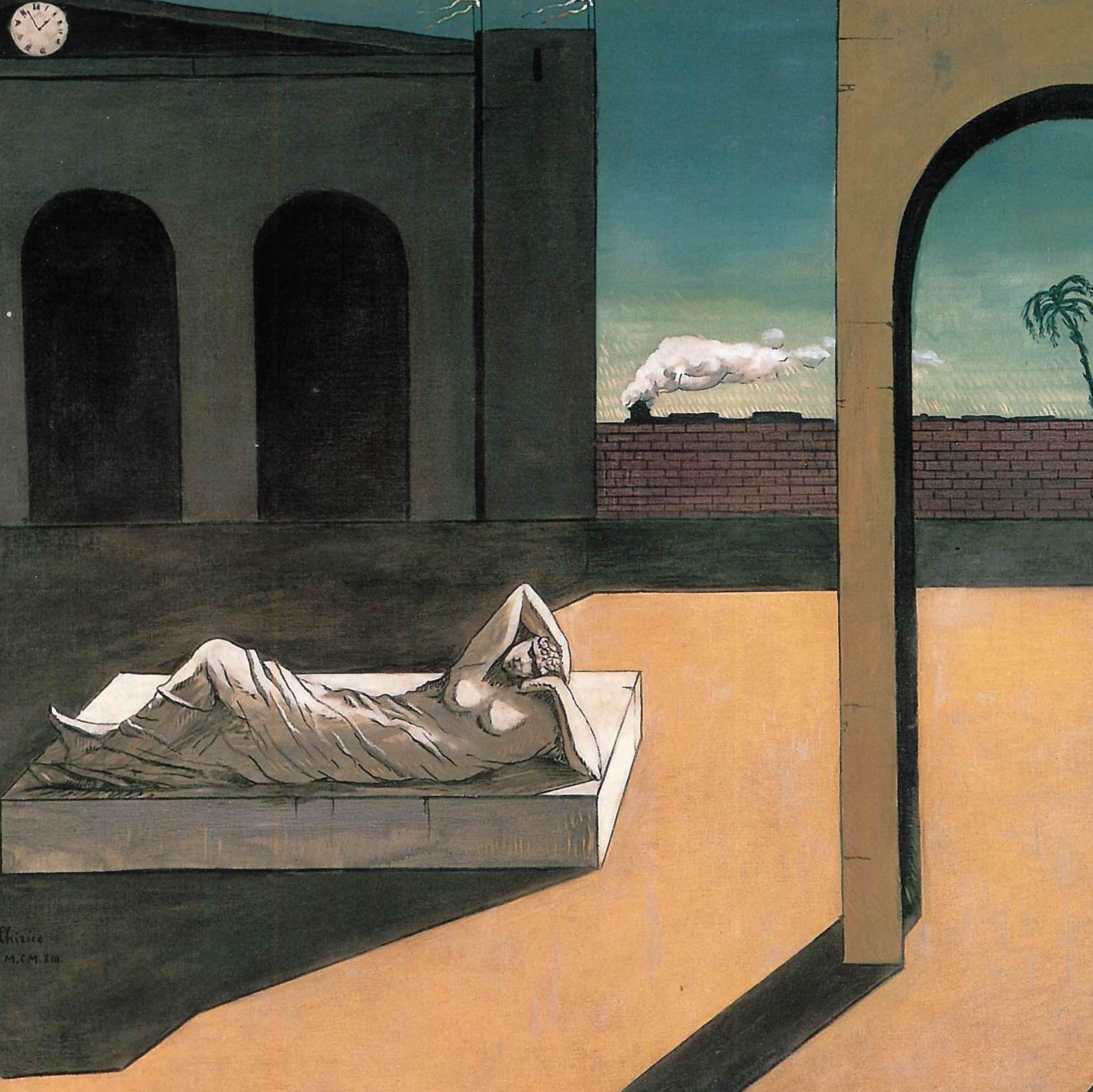 Between 1910 and 1917 he developed the ‘Metaphysical’ style for which he remains best known, using a figurative vocabulary to depict strangely unreal, dreamlike scenes set in deserted city squares or cramped interiors, containing apparently random collections of unrelated objects and looming, faceless mannequins. Such imagery exerted an enormous impact on the work of Carlo Carrà when the two artists met in Ferrara during the First World War.
